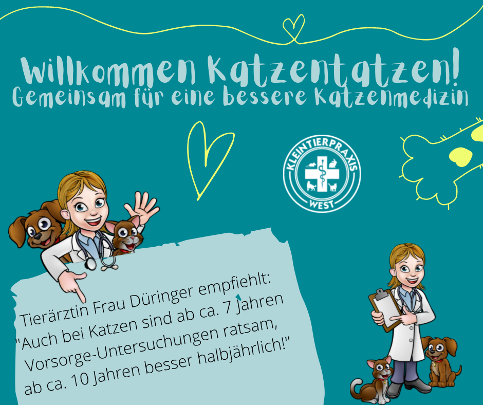 Diegute Nachricht ist jedoch, dass man mit einer jährlichen (imfortgeschrittenen Alter halbjährlichen) Vorsorge einige Erkrankungenvorbeugen oder diese frühzeitig erkennen und somit behandeln kann.Gerne beraten wir Sie, welche Untersuchungen wie Blut-Checks oderBlutdruckmessungen für Ihre Katze sinnvoll sind.